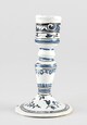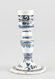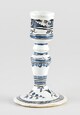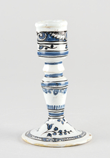 Petit chandelier à large pied conique, corps conique à bague, terminé par le porte bougie tubulaire, lèvre retroussée, au décor bleu, noir et manganèse constitué d’une frise sur le pied alternant volutes et feuillages stylisés en réserve, tiges florales ; liserés, stries et anneaux sur le corps ; liseré, tige et frise en réserve sur l’embout.