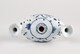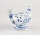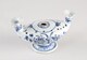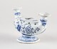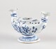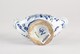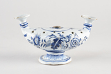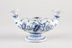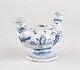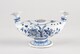 Bouquetière en forme de saucière, oblongue, à pied individualisé à large assise annulaire, panse aplatie renflée de section ovale, perforée sur sa périphérie et comportant en son centre et aux extrémités trois goulots évasés à bague, celui du milieu manque, décor bleu-blanc consistant en un registre concentrique sur le pied orné de pétales, sur la panse composition florale autour de laquelle volent des papillons alternant avec des oiseaux.