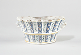 Bouquetière semi-circulaire, assise plate, au dos rectiligne, panse cannelée, sur le dessus ouverture semi-circulaire agrémentée de vingt-six trous, décor en deux registres séparés par un ressaut à liseré jaune, repris sur l’assise, sur chaque cannelure décor végétal genre grotesques alternant avec une tige végétale, une préhension de chaque côté fait d’un mascaron à la bouche entrouverte.