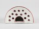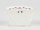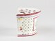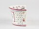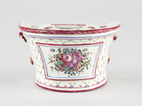 Bouquetière d’allure semi-circulaire, paroi évasée, dos rectiligne à deux perforations de suspension en haut, deux anses verticales manquantes, ouverture semi-circulaire sur le dessus agrémenté de treize trous ; décor de treillis parsemé de petites fleurs ; au centre, bouquet encadré légèrement en retrait.