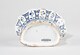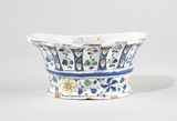 Bouquetière d’applique à dos rectiligne, paroi évasée godronnée, bord chantourné, au décor polychrome consistant en deux registres séparés par un filet soulignant un renflement, registre inférieur orné d’une guirlande florale, registre supérieur fait d’une alternance de tiges florales et de lambrequins sur fond bleu ; en partie supérieure deux trous destinés à la suspension, huit perforations autour d’une plus large.