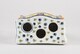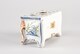 Bouquetière en forme de commode en tombeau, pieds galbés, quatre tiroirs en façade, coquilles rocailles sous le plateau, sur la ceinture et aux angles, ornée sur les côtés d’une maison dans un paysage stylisé en camaïeu de bleus, sur le plateau trois trous et douze perforations orné d’un semis d’étoiles.