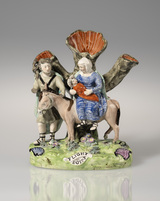 Bouquetière en ronde-bosse sur une base ovale au décor polychrome de végétation surmonté d’un groupe représentant la Fuite en Egypte de la sainte Famille (Jésus, Marie et Joseph), Joseph conduit l’âne sur lequel Marie est assise tenant l’enfant Jésus dans ses bras.