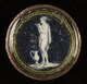 Bouton circulaire, légèrement convexe, orné d’une scène délimitée par plusieurs filets or concentriques, figurant une jeune femme, de trois-quarts gauche, nue, vêtue d’un cape lui couvrant els épaules et le dos, hanchée, buvant à une coupe, une aiguière à ses pieds.