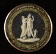 Bouton circulaire, légèrement convexe, orné d’une scène délimitée par plusieurs filets or concentriques et un rang de grènetis, figurant Vénus, de profil droit, au buste dénudé, au drapé sur les hanches, fixant la cape de mars, de face, tête tournée, casquée, appuyé sur sa lance, auquuel l’Amour, à sa gauche, de profil, tend son arc.