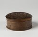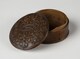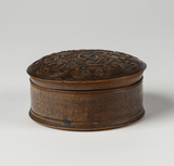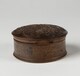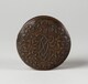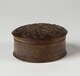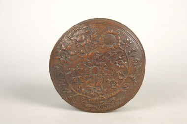 Boîte de toilette, à assise annulaire, de forme circulaire, à couvercle circulaire, à décor en relief et gravé de rinceaux, de fleurs stylisées et d’un monogramme central entrelacé.