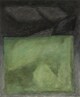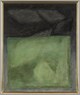 Composition abstraite d’aplats de couleurs formés d’un fond noir et gris parsemé de motifs trapézoïdaux surmontés d’un large rectangle vert en partie inférieure.
