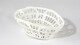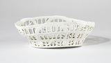 Corbeille ovale, ajourée, à fond blanc, bord chantouné, au décor en relief constitué sur le corps de motifs de baie sur trois niveaux, orné d’arches feuillagées, rubans et fleurettes, cordons striés.