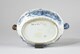 Terrine oblongue, assise oblongue, bord chantourné, godrons dans le prolongement sur le corps, deux anses en bouton de fleur, au décor en camaïeu bleu constitué d’un paysage chinois de part et d’autre figurant une habitation en bord de mer, sur une île, au milieu de la végétation, pont, barques à voile, pagode animent la représentation.