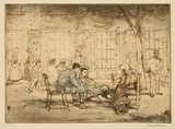 Dans la cour d’un hôpital, deux soldats français assis sur des chaises reçoivent la visite d’une vieille dame ; dans le fond, un groupe est assis ; sur la gauche, deux infirmières discutent ; sur la droite, un soldat se tient debout, les mains dans les poches.