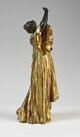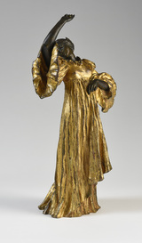 Ces drapés fluides et le mouvement du corps maintenu dans une position d’arabesque confèrent à l’ensemble un élégant jeu de courbes et contrecourbes, faisant de cette figure raffinée et aérienne un emblème de l’Art nouveau. On retrouve de ce mouvement la référence à la femme-fleur, mais aussi à la mode des milieux artistiques alors transformée par de nouvelles préoccupations esthétiques et de confort, avec des robes fluides sans corsets.