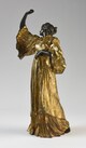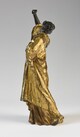 Cette Danseuse à la marguerite fait partie du surtout du Jeu de l’écharpe conçu par Agathon Léonard pour la manufacture de Sèvres, dans le but de sa présentation à l’Exposition Universelle de 1900. Léonard avait été repéré par Alexandre Sandier, tout nouveau directeur de la manufacture, alors qu’il présentait en 1897 au Salon un projet de décor de foyer d’opéra. Souhaitant renouveler sa production vers le style Art nouveau en plein essor, Sandier demande à Léonard d’adapter ses œuvres pour un surtout de 15 personnages : onze danseuses, deux musiciennes et deux porteuses de flambeaux. L’ensemble, récompensé d’une médaille d’or, est salué par la critique et le public, qui apprécient la nouveauté de ce sujet dynamique, la qualité de son exécution et l’harmonie de sa disposition. Les statuettes sont ainsi déclinées pour la vente en biscuit de Sèvres et en bronze doré qui, ici, souligne par sa brillance la finesse des plis et assoit la présence éclatante de la danseuse.