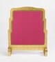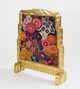 Écran à deux pieds perpendiculaires ornés d’arcs de cercle, frise géométrique en partie inférieure et encadrant la tapisserie aux motifs floraux couvrants aux couleurs vives, légèrement cintré en partie supérieure, degrés sur les côtés.