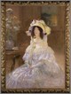 Jeune femme de trois-quarts, vêtue d’une robe lilas ornée de dentelles, d’un médaillon autour du cou et d’un large chapeau de paille décoré de fleurs et de rubans pastel. Assise sur un fauteuil canné, les mains posées sur les genoux, elle est placée près d’une table où repose un grand bouquet de fleurs, dans un intérieur élégant et chaleureux.