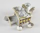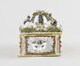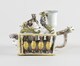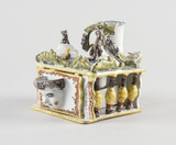 Encrier muni d’un tiroir, accueillant deux godets, chacun muni de son couvercle, côtés ajourés à balustres, au dos anse zoomorphe à l’effigie d’un lynx, sur le dessus deux trous ovales accueillant les côtés agrémentés de deux trous, surmontés d’un vase évasé à piédouche reliés à l’encrier par deux branches ornées de pampres de vigne, feuilles en relief peuplé au centre d’un oiseau posé sur une guirlande tourné vers le vase ; tiroir orné d’un mascaron masculin représentant Bacchus, tronqué au niveau du front, évidé, souligné sur le pourtour d’une frise végétales ; godets soulignés de traits et de ponctuations, repris sur chaque couvercle à la préhension faite d’un chat tigré couché sur le ventre la tête redressée, tous deux orientés vers l’oiseau ; un godet creux destiné à l’encre, l’autre, à nombreuses perforations destinées aux plumes.