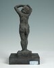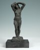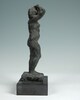 Femme nue s’appuyant sur la jambe gauche, la jambe droite légèrement pliée, les deux bras levés au-dessus de la tête, le visage penché.
