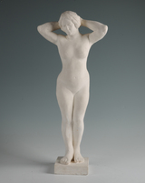 Cette Etude est probablement celle qu’elle expose au Salon de 1922. Elle prouve sa capacité d’observation et de rendu réaliste du corps humain : les formes sont bien définies et synthétisées pour offrir la vision d’une femme toute de rondeur et de solidité. Le léger contrapposto induit par la pose prise les bras relevés empêche toute monotonie, et peut évoquer la référence classique de la Vénus antique. Le musée rémois en conserve deux autres versions, habillées d’une robe ample à bretelles, évoquant un vêtement antique ou une toge d’artiste. L’œuvre a été agrandie en pierre par Rousaud, ce qui indique la reconnaissance contemporaine de sa qualité. La version vêtue, cachant ces courbes derrière un tissu rectangulaire, insiste sur l’impression de stabilité et de pesanteur, et rend l’ensemble davantage simplifié et lisse, esthétique appréciée dans les années 1920 alors que l’Art Déco est au plus fort de son succès.
