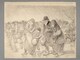 Foule de civils en marche ; au premier plan, famille composée d’un couple de vieillards, d’une jeune femme et de ses deux enfants.