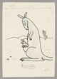 Scène figurant dans le désert, de profil gauche, un kangourou qui a dans sa poche marsupiale un explorateur.