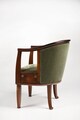 Fauteuil de bureau, à quatre pieds, tournés à l’avant, moulurés et volutes à l’arrière, à dossier plein en gondole en continuité avec les accotoirs, garniture en velours cloué, au décor de marqueterie constitué d’une ceinture à damier sur les pieds avant, galon sur l’avant aux motifs stylisés, deux motifs carré à feuilles sur chaque côté.