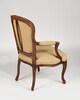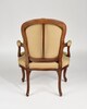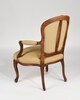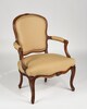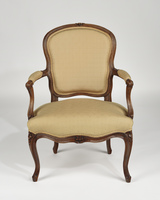 Fauteuil cabriolet à garniture en tapisserie, accotoirs légèrement écartés, garnis de manchettes fixes. Supports d’accotoirs en console légèrement en retrait. Bois de la structure du siège mouluré. Une fleurette orne le centre de la ceinture ainsi que le couronnement du dossier. Pieds cambrés sculptés à l’avant d’une fleurette.