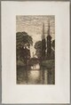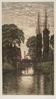 Fin de journée atteste vraisemblablement de cette première manière qui prend pour sujet les paysages de la côte Nord-Est. Le cours d’eau qui structure la composition, sur lequel stationne une barque près d’un moulin à l’arrêt, évoque les productions des barbizonniens. Pourtant, ici, l’artiste fait preuve d’un réalisme affirmé, d’une certaine véracité qui tend à la dureté. Outre la nature, c’est l’activité humaine et la capacité de l’homme à la transformer qui transparaissent dans cette estampe. La figure humaine, d’ailleurs, n’est pas dissimulée ; bien que les silhouettes restent discrètes, tant le moulin que le pont jeté au-dessus de la rivière, au centre, focalisent l’attention du spectateur.