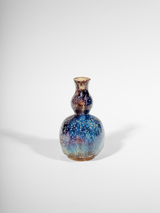 Flacon, assise annulaire, panse arrondie, col à renflement, au décor flammé violacé sur fond bleu.