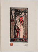 Femme, de face, la tête penchée, clouée par des liens sur les bras à une porte, ensanglantée, le ventre éventré laissant échapper un foetus, le sein droit mutilé.