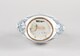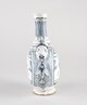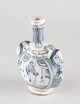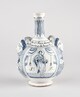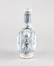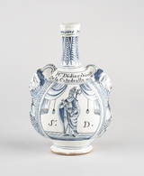 Gourde à pied individualisé, assise annulaire, panse circulaire aplatie, haut col cylindrique, goulot épaissi, mufles de lion sur les côtés tenant une guirlande de fleur en guise de préhensions, au décor en camaïeu de bleus consistant en filets sur le pied, médaillons de part et d’autre de la panse surmontés d’une légende, figurant sur l’un saint Jean-Baptiste, en pied, de face, auréolé, vêtu d’une peau animale, tenant le Livre et l’Agneau montré de l’index droit, sur l’autre l’évêque saint Didier, en pied, de face, drapé, coiffé de la mitre, portant la crosse, lisant le Livre, tous deux sur fond de décor théâtral, registres triangulaires sur le col ornés de chevrons, filets sous le goulot.