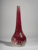 Vase bouteille, assise plate, panse ovoïde, long col cigogne conique, au décor flammé rouge et gris.