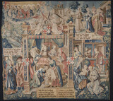 Tapisserie de haute lisse présentant cinq scènes organisées en différents registres, et illustrant la naissance de saint Remi. En haut à gauche : saint Montan, ermite aveugle des Ardennes, est endormi près de son ermitage. Dans un nuage lui apparaissent le Christ, la Vierge, des apôtres, qui lui annoncent que Céline, épouse du comte Émile de Laon, enfantera un fils qui deviendra un grand saint / En haut à droite : saint Montan annonce l’heureuse nouvelle à Céline / En bas à gauche : Celine annonce l’heurese nouvelle à son époux / Au centre : la naissance de saint Remi / En bas à droite : Céline tient sur ses genoux l’enfant Remi, qui touche du doigt les yeux de saint Montan, agenouillé, qui recouvre ainsi la vue.