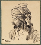 Portrait d’un homme barbu de trois-quarts gauche. Son costume comporte un turban, une chemise et une veste.