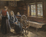 Intérieur rustique éclairé par la lumière d’une fenêtre : une vieille femme, assise près d’un rouet, s’entretient avec une jeune femme debout, tandis qu’un enfant blond les observe, accoudé à une table.