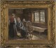 scène de genre femme vieille assis chaise foulard rouet discussion jeune femme en pied costume traditionnel garçon accoudé intérieur maison fenêtre effet de lumière