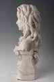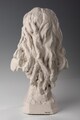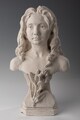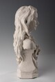 Jeune fille en buste, épaules nues, yeux aux pupilles excisées, encadré par une longue chevelure bouclée, piédouche à base de section rectangulaire à pans coupés, agrémenté devant d’une tige de lys.