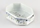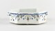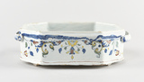Cuvette tripode octogonale oblongue, fond plat, parois rectilignes, évasé à la base, bord épaissi biseauté, lèvre redressée, deux anses horizontales arrondies fixées au moyen de deux pastilles sur les petits côtés, au décor polychrome consistant au fond en un rinceau floral, sur les parois, sous le bord, lambrequins floraux et rinceaux, anses zébrées.