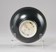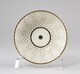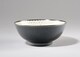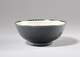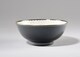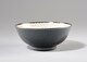 Jatte de style japonisant, pied annulaire, corps ovoïde, fond gris, liseré doré, décor en face interne sur fond blanc constitué de losanges, pétales en relief, rehauts dorés, fleur stylisée au fond dans un médaillon orné de points en relief.