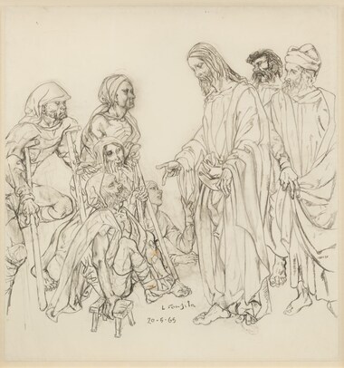 Jésus, en pied, de trois-quarts gauche, drapé, barbu, les cheveux longs dénoués, s’approchant d’infirmes, situés à gauche de la composition, aux membres bandés, certains assis au sol, d’autres se déplaçant au moyen de béquilles, derrière lequel se tiennent deux disciples, de profil gauche, l’un barbu, l’autre coiffé d’un turban.
