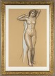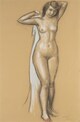 Jeune femme nue, debout, légèrement de trois-quarts droit, les bras levés derrière la tête, tenant un drapé blanc retombant le long de son dos.
