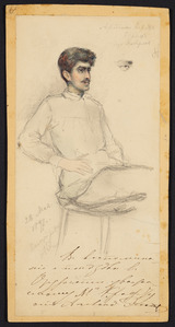 Jeune homme assis sur une chaise, il est représenté de trois-quarts, le regard porté vers la droite, il porte une moustache et pose la main sur sa hanche. Détail d’un oeil en haut à droite.