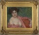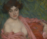 Jeune femme assise, à mi-corps et de trois-quarts, accoudée, les cheveux bruns relevés en chignon et le regard baissé, vêtue d’un déshabillé rose et rouge laissant l’épaule droite découverte, sur un fond de feuillage.