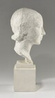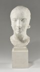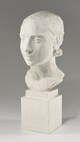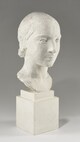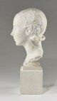 Tête féminine sur un haut socle cubique, cou nu, chevelure plaquée, bouclant légèrement sur la nuque, pupilles excisées.