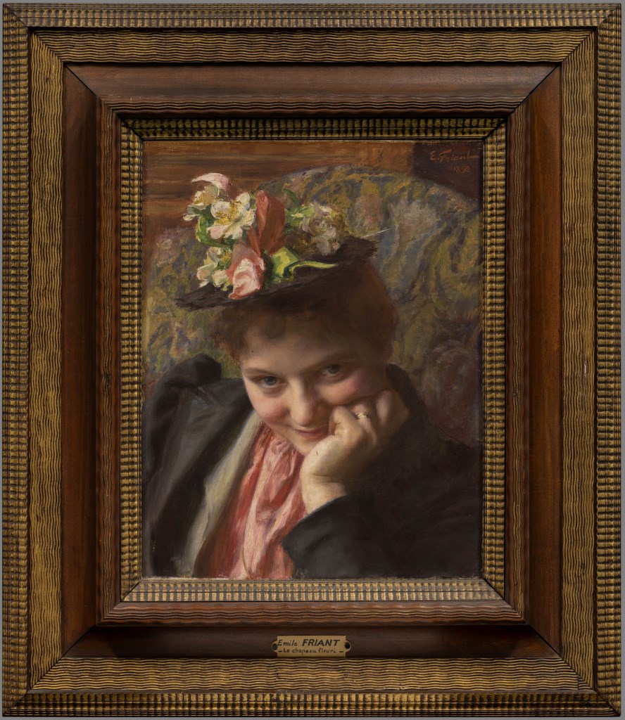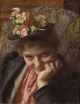 Portrait d’une jeune femme, assise, en buste, de face, accoudée, la main gauche sous le menton, souriante, coiffée d’un chapeau fleuri.