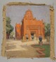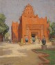 Vue du pavillon de l’Afrique occidentale, vase architecture couleur terre couronné d’un dôme ogival parsemé de madriers, grand portique orné de bas-reliefs ; au premier-plan, chemin bordé de parterres et de vases ovoïdes.