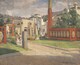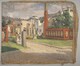 Vue du pavillon des Galeries Lafayette et des Éditions Crès ; en arrière-plan, couronnement d’une des quatre tours de Plumet et au premier-plan, jardins de Jacques Lambert.