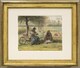 Jeune paysan assis sur une brouette, chaussé de sabots, chapeauté, une veste sur les genoux, fumant la pipe, présentant devant lui deux éléments, un couteau posé au sol, attentivement observé par une jeune paysanne, assise au sol, vêtue d’une robe, la tête recouverte d’un voile, main droite sur la jambe, main gauche contre la joue, dans un jardin clos, aux outils et accessoires visibles en arrière plan ; à gauche, allée d’arbre fruitiers, plants ; en arrière-plan, village aux maisons aux toits de chaume.