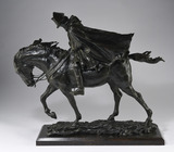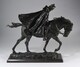 Cavalier sur sa monture drapé d’une cape ; sur socle fixé.
