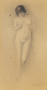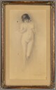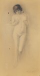 Jeune femme nue, de face, les mains posées sous la poitrine, les cheveux noirs ornés d’un bijou ; esquisse d’un drapé.