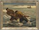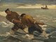 Deux pêcheurs, l’un de trois-quarts gauche, l’autre de dos, immergés aux genoux, halent un filet au milieu des vagues ; barque de pêche en arrière-plan.