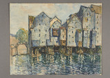 Moulins en pan-de-bois implantés sur pilotis dans le lit d’une rivière.